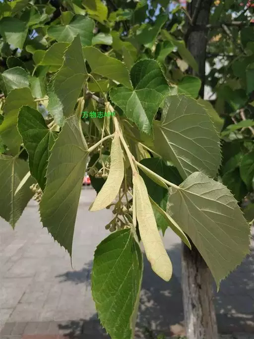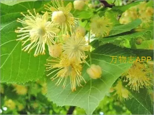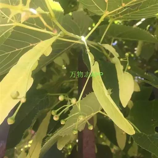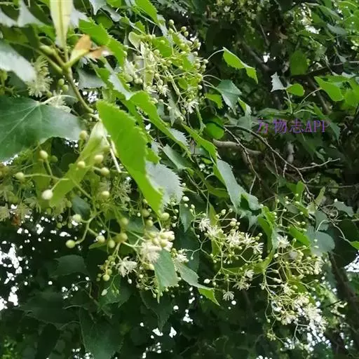 椴树 椴树(原变种),乔木,高20米,树皮灰色,直裂;小枝近秃净,顶芽无毛或有微毛。叶卵圆形,长7-14厘米,宽5.5-9厘米,先端短尖或渐尖,基部单侧心形或斜截形,上面无毛,下面初时有星状茸毛,以后变秃净,在脉腋有毛丛,干后灰色或褐绿色,侧脉6-7对,边缘上半部有疏而小的齿突;叶柄长3-5厘米,近秃净。聚伞花序长8-13厘米,无毛;花柄长7-9毫米;苞片狭窄倒披针形,长10-16厘米,宽1.5-2.5厘米,无柄,先端钝,基部圆形或楔形,上面通常无毛,下面有星状柔毛,下半部5-7厘米与花序柄合生;萼片长圆状披针形,长5毫米,被茸毛,内面有长茸毛;花瓣长7-8毫米;退化雄蕊长6-7毫米;雄蕊长5毫米;子房有毛,花柱长4-5毫米。果实球形,宽8-10毫米,无棱,有小突起,被星状茸毛。花期7月。