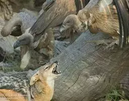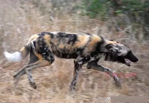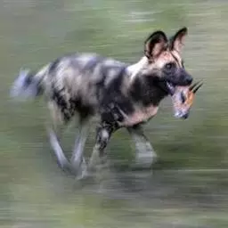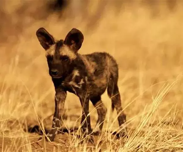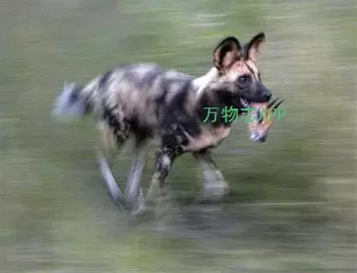 非洲野犬(学名:Lycaon pictus):体长100厘米,尾长30-45厘米,体重17-36千克。毛色较杂乱,包括黑色、黄色和白色等,每个个体毛色斑纹均不相同。前肢无爪。前臼齿较大,可磨碎大型骨头,类似鬣狗。群居,通过叫声进行定位。采取群体合作方式猎杀中型有蹄动物,追击时速可达45千米。全年可繁殖,多为雨季,每胎产2-19仔,通常10仔,幼仔一般在其他动物(比如土狼)的巢穴中出身,12-18个月性成熟。