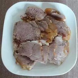 4.煮制:锅底码放骨头或竹板子,将嫩肉码放中间,老肉码放四边,兑进开水,加入全料口袋,老抽多加,葱姜蒜等用旺火煮半小时后压锅。压锅的方法是用竹板子或其它如盘子等压在牛肉上,竹板上加重物压住。