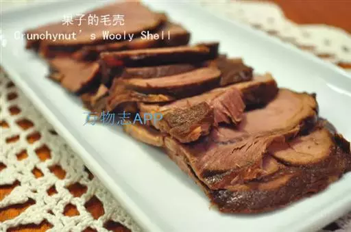 4、炖至肉可用筷子扎透即可(我炖了大约一个半小时),要留些汤汁。熟后不用立刻取出,浸泡2、3个小时更入味。凉后切片,切时逆着肉的纹路,否则肉会散的。