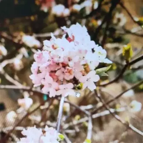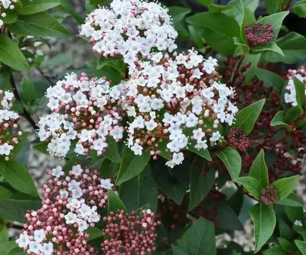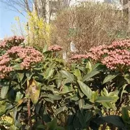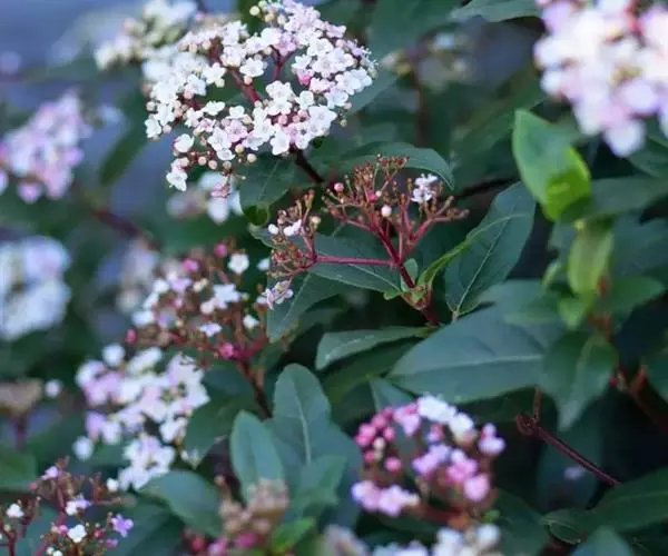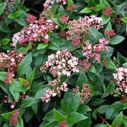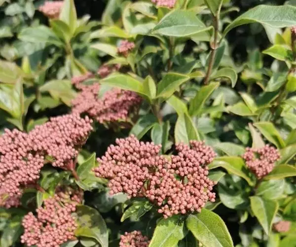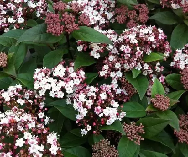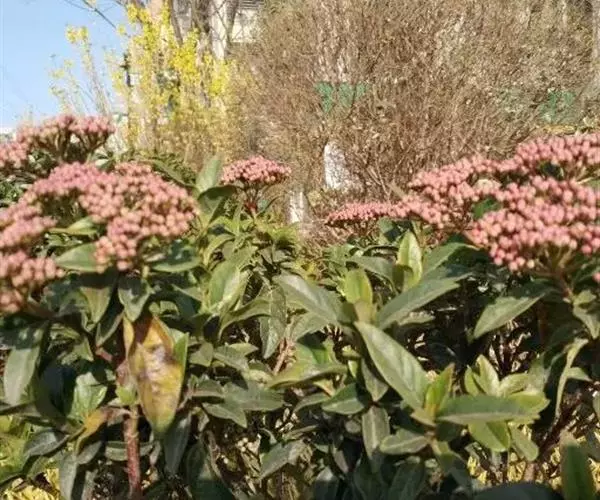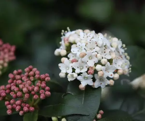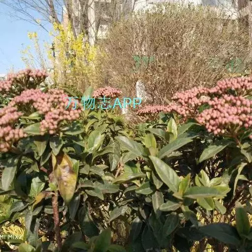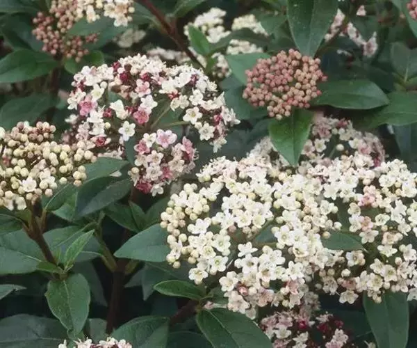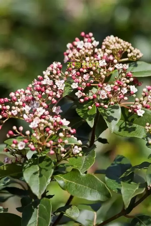 地中海荚蒾为忍冬科常绿灌木,多分枝,聚伞花序,花蕾粉红色,于秋季显蕾,直至第2年春季才开花,花白色,冬、春季都有其特殊的观赏特色。枝叶繁茂,耐修剪,其整形可参照夹竹桃,养护修剪以疏剪为主,宜在春末花后进行。