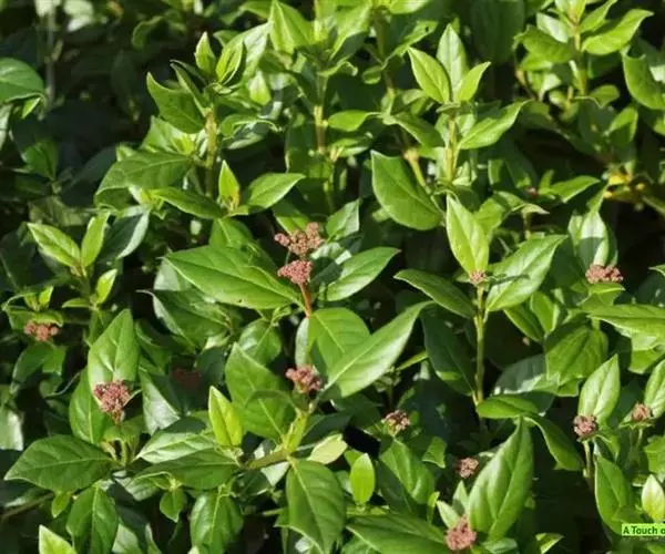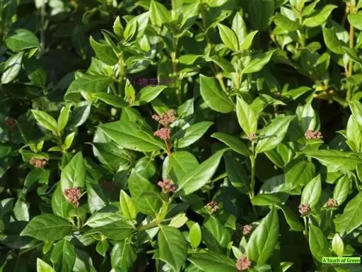 常绿灌木,树冠呈球形,冠径可达2.5一3米。叶椭圆形,深绿色,叶长10厘米,聚伞花序,单花小,仅0.6厘米,花蕾粉红色,花蕾绷很长,可达5个多月,盛开后花白色,整个花序直径达10厘米,花期在原产地从11月直到翌存4月。10月初便可见细小的黄绿色花蕾,随着花序的伸长,花蕾越来越密集覆盖于枝顶,颜色也逐步加深呈殷红色,远远望去像一片片红云,飘浮在墨绿色的树冠上,果卵形,深蓝黑色,径0.6厘米。