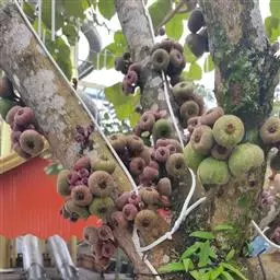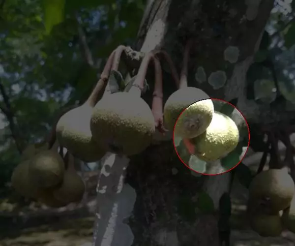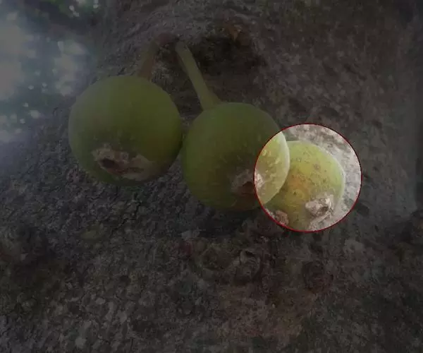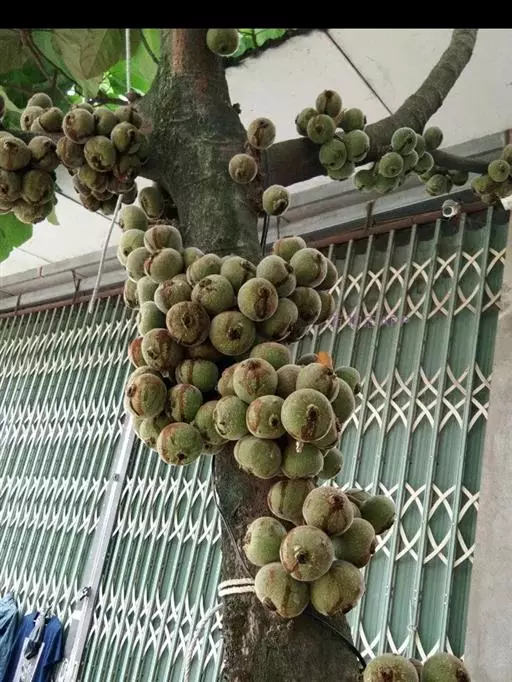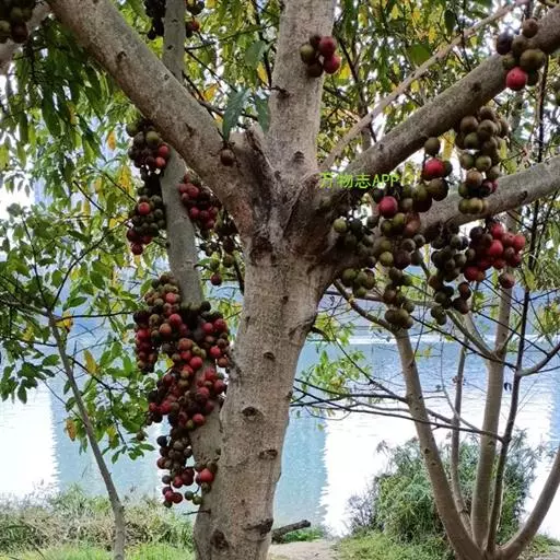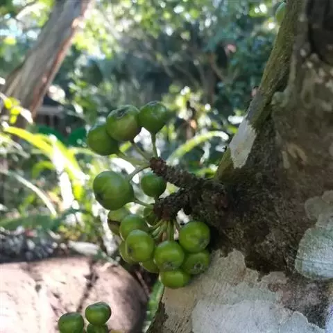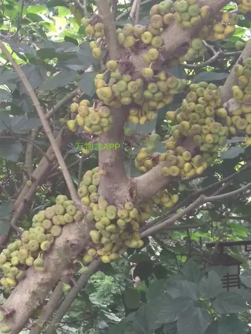 榕果簇生于树干基部或老茎短枝上,大而梨形或扁球形 至陀螺形,直径3-5 (-6)厘米,具明显的纵棱8-12条,幼时被白色短柔毛,成熟脱 落,红褐色,顶生苞片宽三角状卵形,4-5轮覆瓦状排列而成莲座状,基生苞片3枚,卵 状三角形;总梗长4-6厘米,粗壮,被柔毛;雄花,无柄,花被片3,匙形,薄膜质,透 明,雄蕊2,花药卵形,花丝长;瘿花花被片下部合生,上部3裂,微覆盖子房,花柱侧 生,被毛,柱头膨大;雌花,生于另一植株榕果内,有或无柄,花被片3裂,子房卵圆形, 花柱侧生,被毛,较瘿花花柱长。瘦果有粘液。花期8月至翌年3月,果期5-8月。