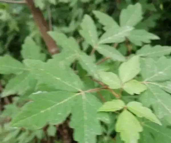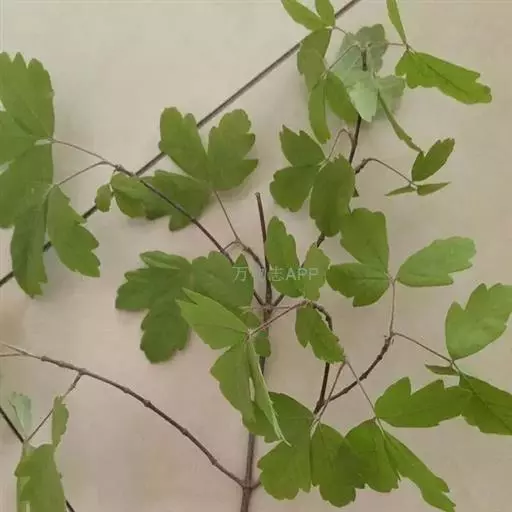 复叶有3小叶;小叶纸质,卵形,椭圆形或长圆椭圆形,长5-8厘米,宽3-5厘米,先端钝尖,边缘有2-3个钝形大锯齿,顶生的小叶片基部楔形或阔楔形,有5-8毫米的小叶柄,侧生小叶基部斜形,有长2-3毫米的小叶柄,上面绿色,嫩时有短柔毛,渐老则近于无毛;下面淡绿色,略有白粉,有淡黄色疏柔毛,叶脉上更密,主脉在上面略凹下,在下面凸起,侧脉9-11对,在上面微凹下,在下面显著;叶柄长2-4厘米,有疏柔毛,嫩时更密。