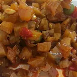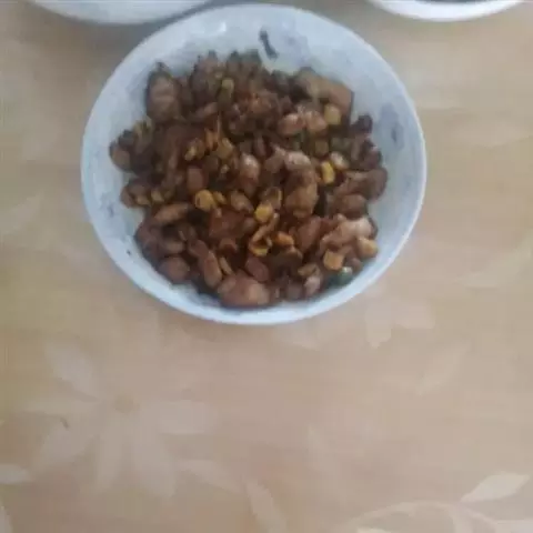 2、锅置火上,下同烧至七成热时,倒入鸡丁滑熟后,滗起待用。