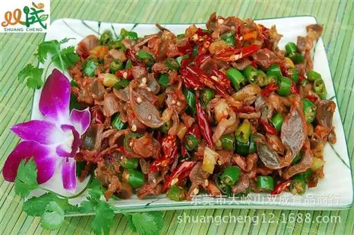 辣子鸡 3、锅留底油至热,下干辣椒炒至棕红色,下花椒炒香,倒入鸡腿,烹入料酒,簸匀加入盐、味精、胡椒、白糖、醋、烹入鲜汤炒至鸡丁回软。汁干时,下马耳朵葱簸匀起锅即成。