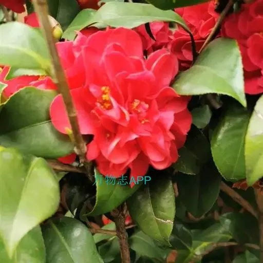 花牡丹:山茶的栽培品种。叶深绿,椭圆形,叶面上有黄斑。花鲜红底色,上洒白斑块。花期11月至翌年1月。