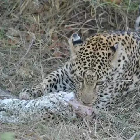 花豹是大型肉食性动物,体形似虎,但明显较小;头小尾长,四肢短健;毛被黄色,满布黑色环斑;头部的斑点…