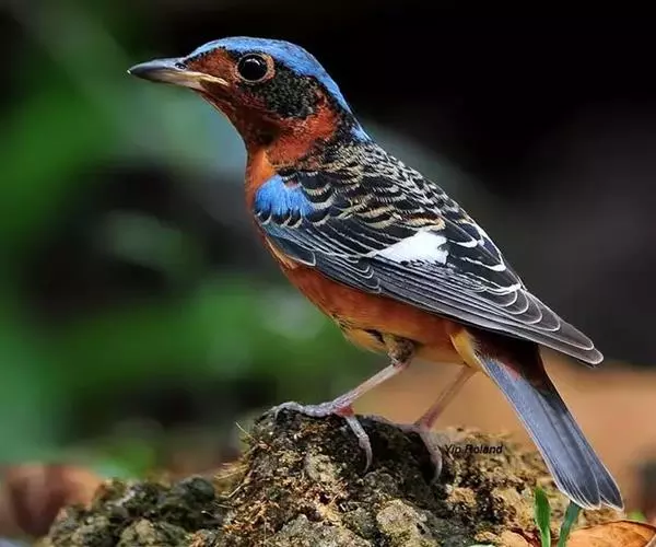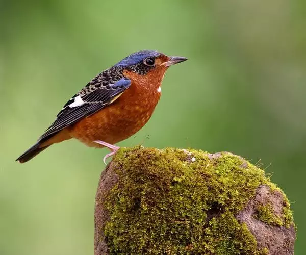 雄鸟:额至后颈、翅上覆羽钴蓝色,背、翅、尾黑色,翅具白色翼斑,腰栗色。下体栗色。