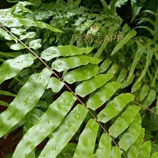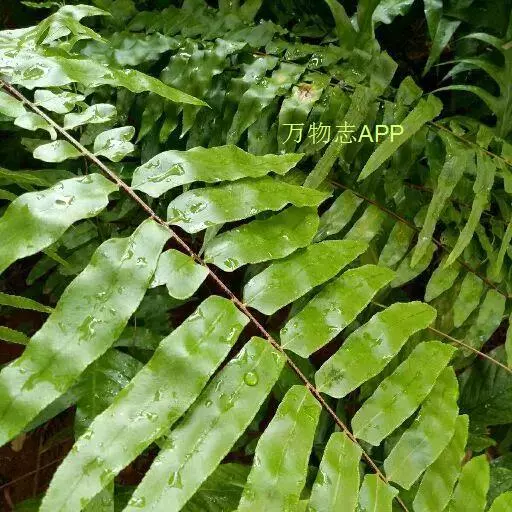 叶簇生,柄长10-30厘米,粗达4毫米,坚实,上面有纵沟,下面圆形,灰褐色或淡褐棕色,略有光泽,基部被披针形鳞片及纤维状鳞片;叶片通常长70-80厘米或超过1米,宽14-30厘米,狭椭圆形,一回羽状,羽片多数(约35-50对),互生,偶有近对生,相距1.5-3厘米,有极短柄或近无柄,以关节着生于叶轴,叶轴两侧疏被柔毛,中部羽片披针形或线状披针形,长9-15厘米,宽1-2.5厘米,先端急尖或短渐尖,基部近对称,近圆形或斜截形,叶缘有疏缺刻或粗钝锯齿,主脉两面均明显,侧脉纤细,自主脉斜向上,二至四叉,达叶边附近;下部羽片披针形,较短,先端短尖。叶薄纸质或纸质,干后褐绿色,两面均无毛,幼时两面均略被披针形小鳞片或线形的纤维状鳞片,尤以主脉下面较密,成长时部分或全部脱落。