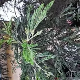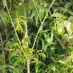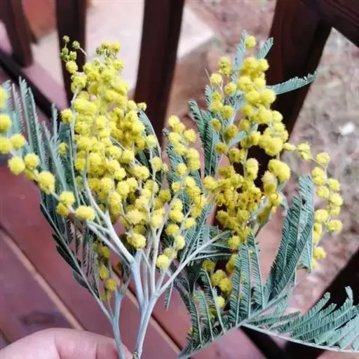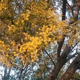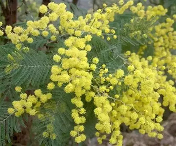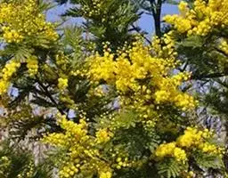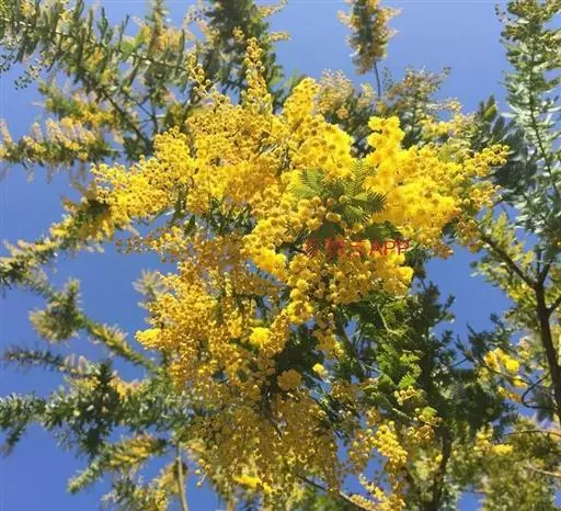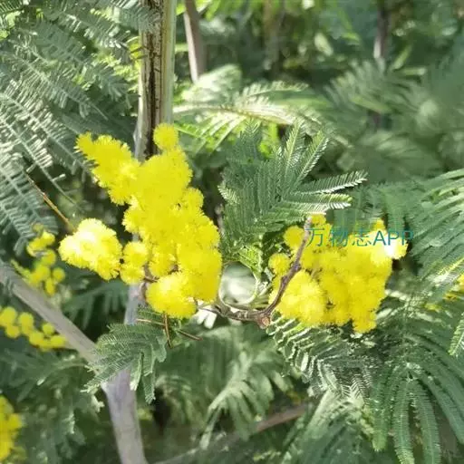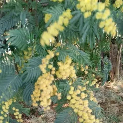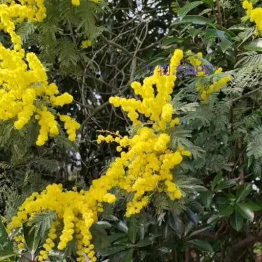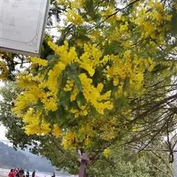 银荆(学名:Acacia dealbata Link),被子植物豆科常绿乔木,高约25米,树干较直,树皮灰绿或灰色;二回羽状复叶,偶数,小叶线形,银灰色或浅灰蓝色。3~4月开花,头状花序,具小花30-40朵,花黄色,有香气。荚果长带形,长3.5-11厘米,果皮暗褐色,密被绒毛。种子卵圆形,黑色,有光泽。