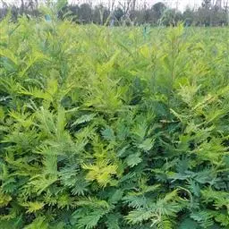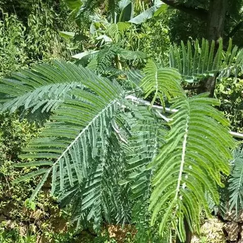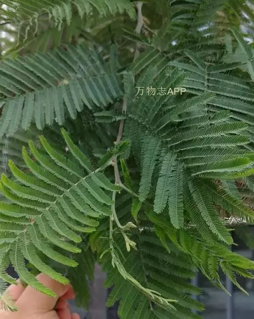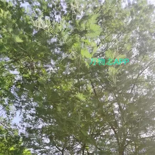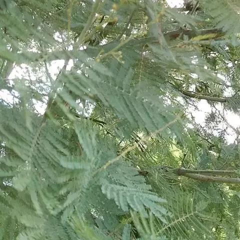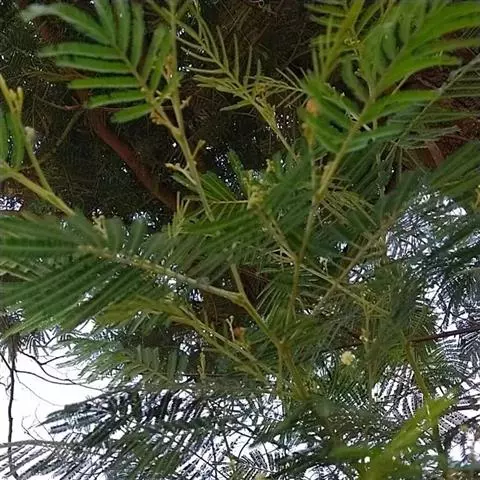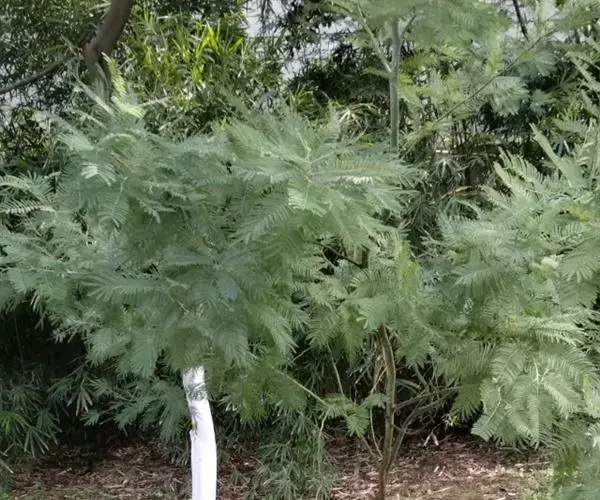无刺灌木或小乔木,高15米;嫩枝及叶轴被灰色短绒毛,被白霜。二回羽状复叶,银灰色至淡绿色,有时在叶尚未展开时,稍呈金黄色;腺体位于叶轴上着生羽片的地方;羽片10-20(-25)对;小叶26-46对,密集,间距不超过小叶本身的宽度,线形,长2.6-3.5毫米,宽0.4-0.5毫米,下面或两面被灰白色短柔毛。