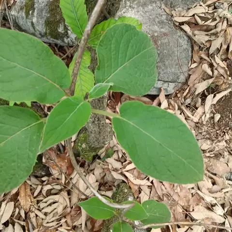 叶纸质,卵状椭圆形至椭圆披针形,长4-7厘米,宽2-3厘米,顶端短尖至渐尖,基部钝形至楔尖,边缘的上半部有小锯齿,腹面绿色,散被粉末状微毛或完全无毛,背面粉绿色,密被短小且密致的灰白色星状茸毛,星状毛在一般放大镜下不易观察,侧脉5-6对,横脉和网状小脉肉眼下不易观察;叶柄长8-20毫米,密被锈褐色茸毛。