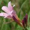 鳞茎卵形,直径约5厘米。秋季出叶,长约8厘米,立即枯萎,到第二年早春再抽叶,叶带状,顶端钝圆,绿色,宽约2厘米。花茎高约60厘米;总苞片2枚,披针形,长约6厘米,宽约1.3厘米;伞形花序有花4-8朵;花淡紫红色;花被裂片倒披针形,长约7厘米,宽约1.8厘米,边缘基部微皱缩,花被筒长约2厘米;雄蕊与花被裂片近等长;花柱略伸出花被外。花期8月。