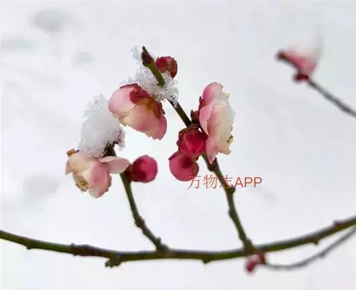 梅(学名:Armeniaca mume Sieb.):小乔木,稀灌木,高4-10米;树皮浅灰色或带绿色,平滑;小枝绿色,光滑无毛。叶片卵形或椭圆形,叶边常具小锐锯齿,灰绿色。花单生或有时2朵同生于1芽内,直径2-2.5厘米,香味浓,先于叶开放;花萼通常红褐色,但有些品种的花萼为绿色或绿紫色;花瓣倒卵形,白色至粉红色。果实近球形,直径2-3厘米,黄色或绿白色,被柔毛,味酸;果肉与核粘贴;核椭圆形,两侧微扁。花期冬春季,果期5-6月。2n=16,24。