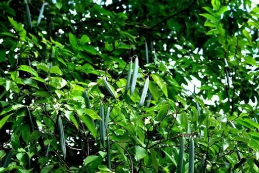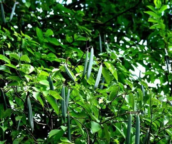 倒吊笔(Wrightia pubescens R. Br.)别名九龙木、墨柱根、章表根、苦常、土北芪、枝桐木、猪松木、细姑木、刀柄,夹竹桃科倒吊笔属常绿乔木。高8-20米,胸径可达60厘米,含乳汁;叶坚纸质,卵圆形或卵状长圆形;聚伞花序内面基部有腺体;花冠漏斗状,白色、浅黄色或粉红色;副花冠呈流苏状;雄蕊伸出花喉之外,花药箭头状,被短柔毛;子房由2枚粘生心皮组成,柱头卵形。花期4-8月,果期8月-翌年2月。