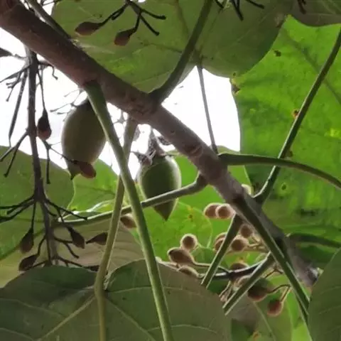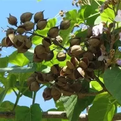 蒴果长圆形或长圆状椭圆形,长6-10厘米,顶端之喙长达6毫米,宿萼开展或漏斗状,果皮木质,厚3-6毫米;种子连翅长6-10毫米。花期3-4月,果期7-8月。