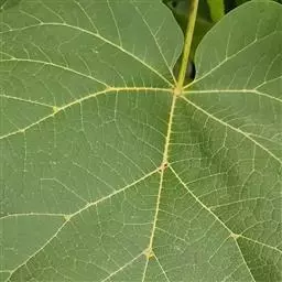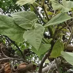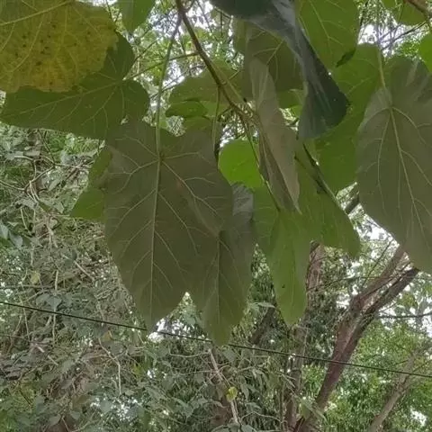 叶片长卵状心脏形,有时为卵状心脏形,长达20厘米,顶端长渐尖或锐尖头,其凸尖长达2厘米,新枝上的叶有时2裂,下面有星毛及腺,成熟叶片下面密被绒毛,有时毛很稀疏至近无毛;叶柄长达12厘米。
