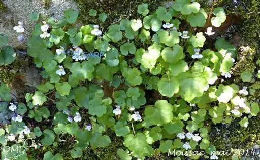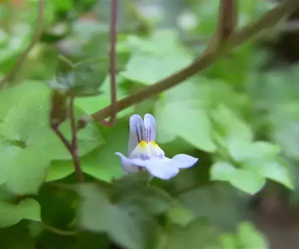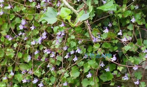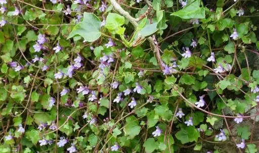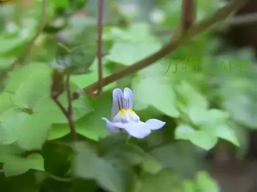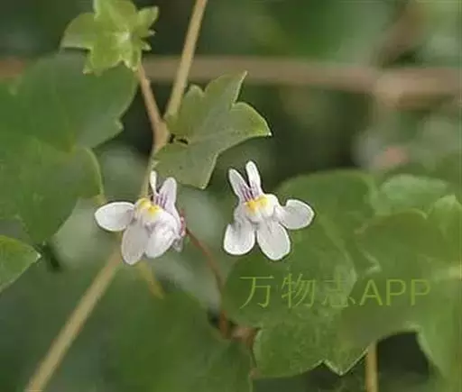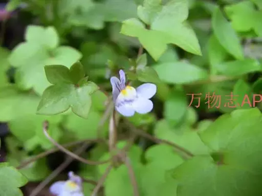 蔓柳穿鱼属(Cymbalaria muralis)蔓柳穿鱼(梅花草、小兔子花、铙钹花),蔓生多年生草 铙钹花 本。茎纤细长达60cm,下部节生细长不定根,单叶互生,叶片心脏圆形或圆肾形半圆形,长0.8~2.5cm,宽1.2~3cm,掌状5~7裂,裂片深达叶片1/3,有时侧裂片又2浅裂,裂片先端具短尖头,叶基深心形,叶柄细弱,长为叶片的2~3倍。花单生叶腋,花梗细,长1.5-2.5cm,花萼5裂,达基部,裂片披针形,长2~2.5mm;花冠蓝紫色或浅蓝色,长9~15mm,花冠筒末端有与萼片等长的短距,上唇二裂,直立,下唇3裂,中裂片隆起呈纵折,封住喉部,纵折呈黄色或白色,具腺毛,雄蕊4,2强;子房球形,花柱单一,柱头细小;种子直径1mm,球形,黑色,具瘤状突起;朔果无毛,长度超过花萼,不规则开裂。