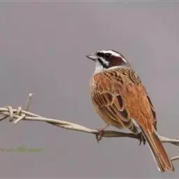 栗斑腹鹀:属小型鸣禽。体重19-25克,体长145-167毫米。头顶至背栗红色,眼先和颧纹黑褐色,…