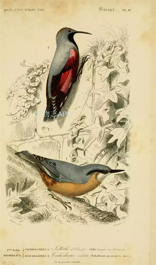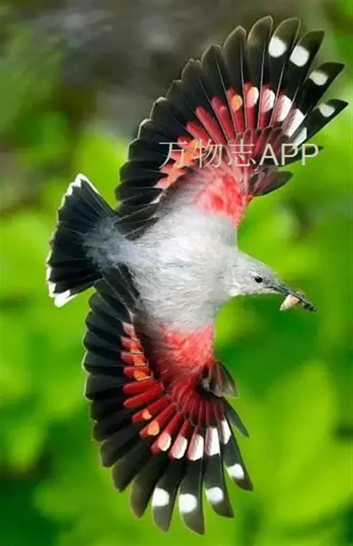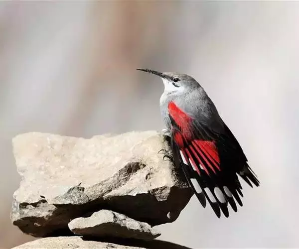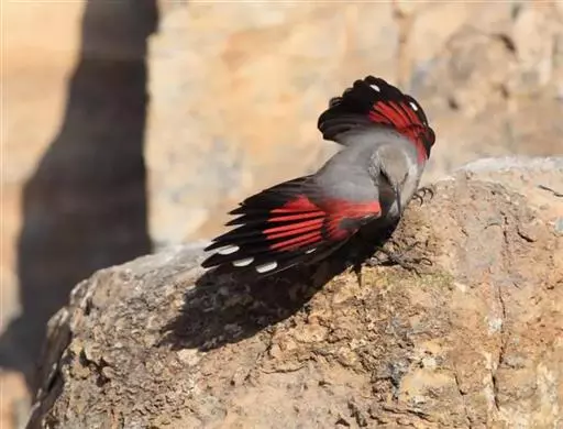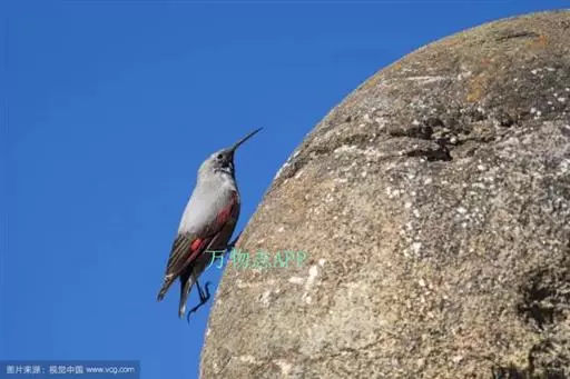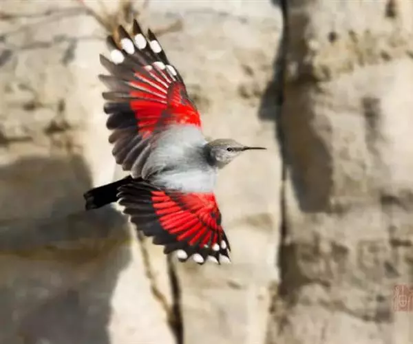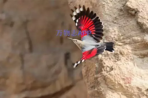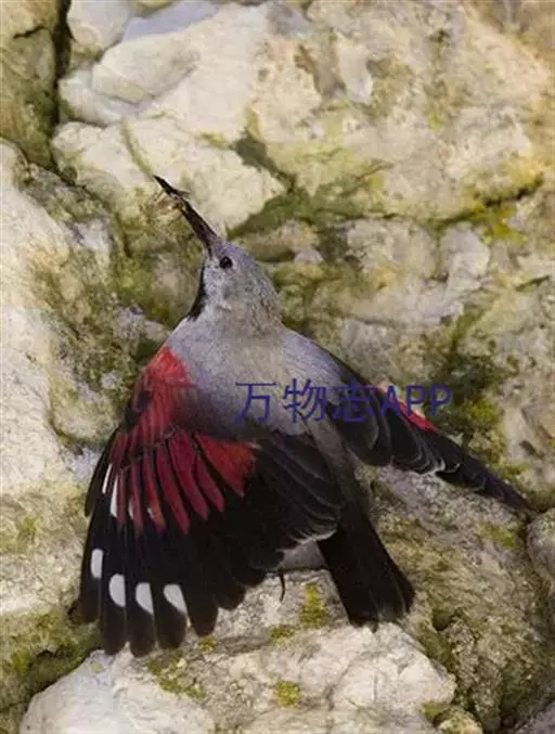 红翅旋壁雀(学名:Tichodroma muraria):体重15-23克,体长120-178毫米。是一种体型略小的鸟类。尾短而嘴长,翼具醒目的绯红色斑纹。飞羽黑色,外侧尾羽羽端白色显著,初级飞羽两排白色点斑飞行时成带状。繁殖期雄鸟脸及喉黑色,雌鸟黑色较少。非繁殖期成鸟喉偏白,头顶及脸颊沾褐。虹膜深褐色,嘴脚黑色。