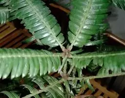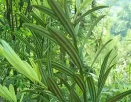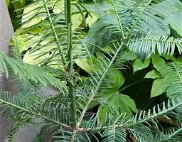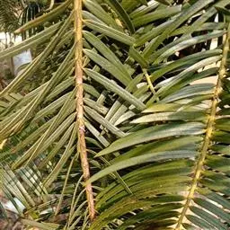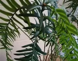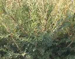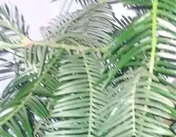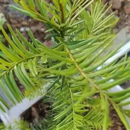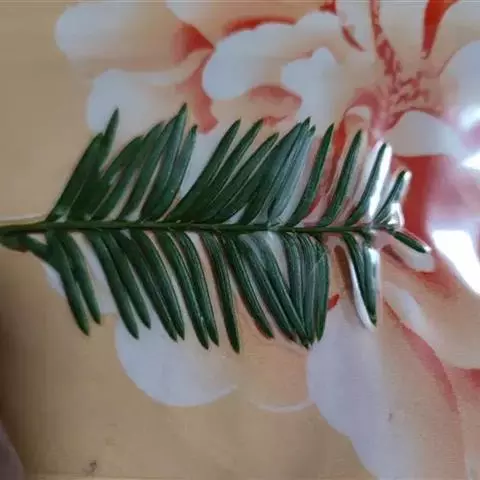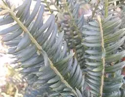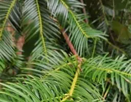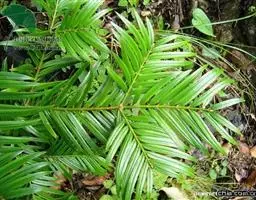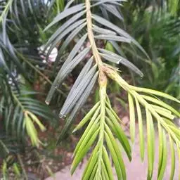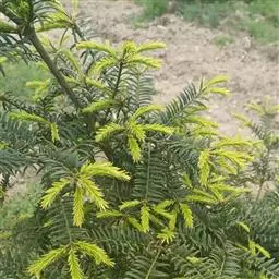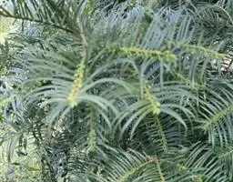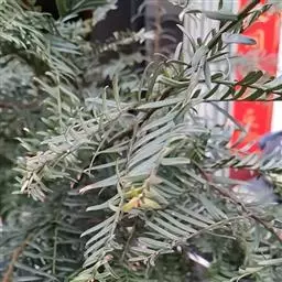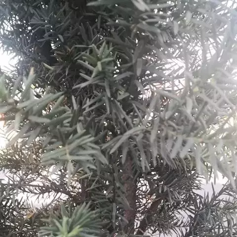 叶排成不规则的二列,斜上伸展,约成45度角,条形,通常直,稀微弯,长1-2.5厘米,宽2.5-3毫米,稀长达4厘米,基部窄,有短柄,先端通常凸尖,上面深绿色, 有光泽,下面有两条灰绿色气孔带,气孔带较绿色边带宽二倍,干后呈淡黄褐色,中脉带上无角质乳头状突起点。雄球花有雄蕊9-14枚,各具5-8个花药。