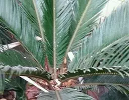 苏铁炭疽病:又名叶枯病,主要为害新抽幼嫩小羽叶片。羽叶受害症状因不同品种而异:或病斑中间深灰色,边缘呈深褐色;或病部变褐色,纵卷成一条线,干枯垂直;或病斑为长椭圆形,土黄褐色,后期黑褐色,病健交界明显(一般以叶脉为界);有的病斑中心红褐色,半圆形、椭圆形或不规则形,外有黄晕,病健交界不清,很难见到小黑点。严重时也可引起羽叶成段枯死。