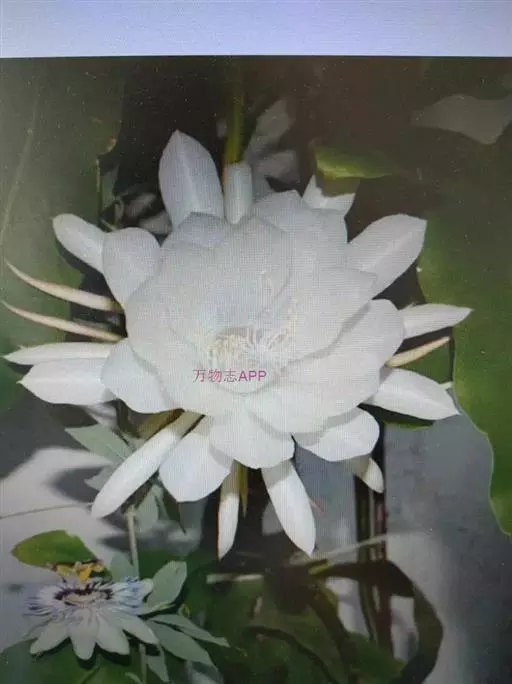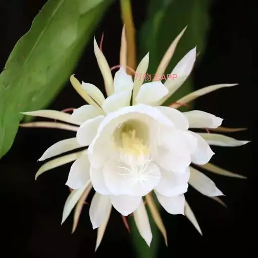 昙花(学名:Epiphyllum oxypetalum (DC.)Haw ):附生肉质灌木,高2~6米,老茎圆柱状,木质化。分枝多数,叶状侧扁,披针形至长圆状披针形,边缘波状或具深圆齿,基部急尖、短渐尖或渐狭成柄状,深绿色,无毛,中肋粗大,老株分枝产生气根。花单生于枝侧的小窠,漏斗状,于夜间开放,芳香,长25~30厘米,直径10~12厘米;花托绿色,略具角,被三角形短鳞片;瓣状花被片白色,倒卵状披针形至倒卵形,长7-10厘米,宽3~4.5厘米,边缘全缘或啮蚀状。浆果长球形,具纵棱脊,无毛,紫红色。种子多数,卵状肾形,亮黑色,具皱纹,无毛。