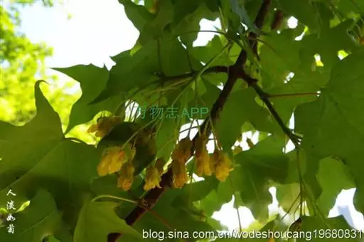 落叶乔木,高9-15米。树皮粗糙,深褐色。小枝圆柱形,无毛,当年生嫩枝淡紫绿色,直径2毫米,多年生老枝深紫色。叶薄纸质或纸质,基部深心脏形或近于心脏形,叶片的宽度大于长度,宽7-10厘米,长5.5 8厘米,通常5裂,中央裂片与侧裂片卵形或三角状卵形,长2.5-3.5厘米,近基部宽2.5-3厘米,先端短急锐尖,尖尾长8-10毫米,基部的裂片较小,边缘具紧贴的细圆齿,裂片间的凹缺锐尖,上面绿色,干后淡紫绿色,无毛,下面淡绿色,除脉腋被黄色丛毛外其余部分无毛;初生脉5条,在两面均显著;次生脉10-11对,约以80度的角与初生脉叉分,在下面较在上面显著,小叶脉仅微显著,叶柄长2-4厘米,淡紫绿色,无毛。