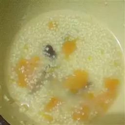 4.先下蟹钳等难熟的下粥中煮开;