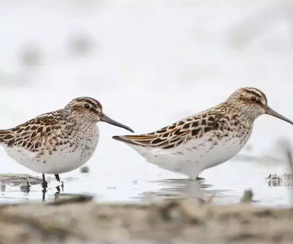 阔嘴鹬是涉禽,体长17厘米。特征为翼角常具明显的黑色块斑并具双眉纹。与黑腹滨鹬平滑下弯的嘴相比,…