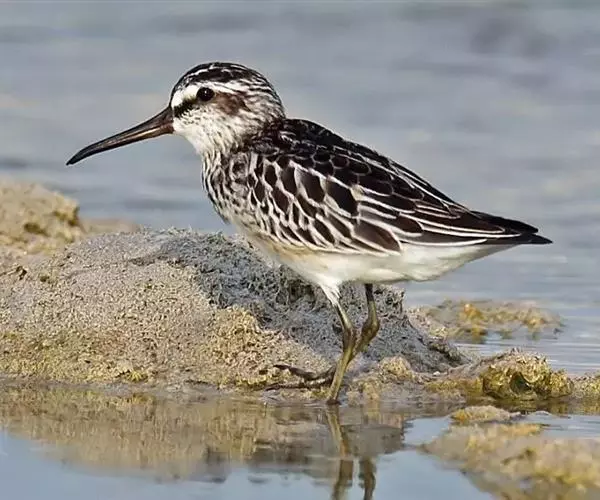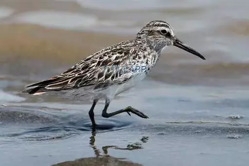 阔嘴鹬(学名:Limicola falcinellus)是涉禽,体长17厘米。特征为翼角常具明显的黑色块斑并具双眉纹。与黑腹滨鹬平滑下弯的嘴相比,阔嘴鹬的嘴具微小纽结,使其看似破裂。上体具灰褐色纵纹;下体白,胸具细纹;腰及尾的中心部位黑而两侧白。冬季与黑腹滨鹬区别在于眉纹叉开,腿短。与姬鹬易混淆,但嘴不如其直,肩部条纹不甚明显。性孤僻,喜潮湿的沿海泥滩、沙滩及沼泽地区。翻找食物时嘴垂直向下。遇警时蹲伏。繁殖于欧亚大陆北部,从斯堪的纳维亚半岛往东到西伯利亚北部,南到中亚吉尔吉斯、叶尼塞河和东西伯利亚南部。越冬于地中海、红海、印度、中南半岛和澳大利亚。