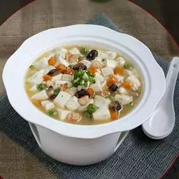 制作香豆腐的大豆含有丰富的营养。以下是几种主要动植物蛋白食品蛋白质价(以标准蛋白质价为100时)的比较:鸡蛋为100,牛肉为83,鱼肉平均为70,稻米为67,全麦粉为53,玉米为59,大豆粉为74,这说明大豆的蛋白质价可与鱼肉相媲美,是植物蛋白中的佼佼者。大豆蛋白属全价蛋白,其氨基酸的组成比较好,人体所必需的8种氨基酸它都有。除蛋白质以外,大豆中含有18%左右的油脂,其绝大部分可以转移到豆制品中去。大豆油脂的亚油酸(人体必需的主要脂肪酸)比例较大,且不含胆固醇,不但有益人体神经、血管、大脑的发育生长,而且还可以预防心血管病、肥胖病等常见病发生。大豆中也含有一些蛋白酶物质、皂甙和破坏维生素的成分,它们对人体健康有不良影响,但只要适当加热即可消除;另一方面,用大豆直接制成食品,人体对其蛋白质的消化吸收率只有65%,而制成香豆腐以后,消化吸收率就可以提高到92%到95%。可见,香豆腐是大豆家族中于人最有益处的。