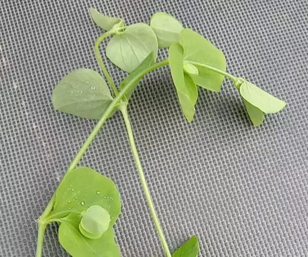 叶片卵状心形,长1-1.5厘米,宽1-1.5厘米,顶端凸尖,具3-5基出脉;叶柄短;托叶数片,小形,白色,刚毛状。