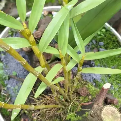 黑毛石斛:茎圆柱形,有时肿大呈纺锤形,不分枝,具数节。叶数枚,通常互生于茎的上部,革质,长圆形。总…