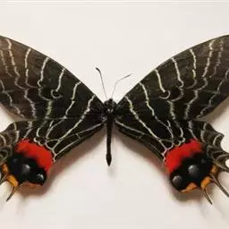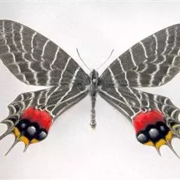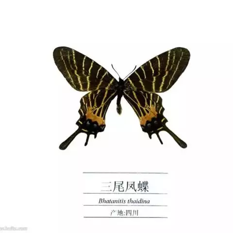 三尾褐凤蝶(学名:Bhutanitis thaidina)又名华西褐凤蝶、三尾凤蝶,凤蝶科,凤尾蝶属的昆虫,三尾褐凤蝶是中国特产蝶类,体中型,前翅长42-48毫米,后翅具尾状突起3个,故称为三尾褐凤蝶。雌雄外形一致,雌虫较雄虫略大。前翅翅表由8条自前缘至内缘的横线划为9个青铜黑色宽横带区。后翅长,外缘呈扇形。前翅翅表的浅黑色宽带呈条纹和点纹伸至后翅翅表;翅表端部有一大红斑、4个橙黄色月形斑及3个浅蓝色盘域中点。后翅有许多黄色宽线和小淡黄色斑。 寄主为木香马兜铃。