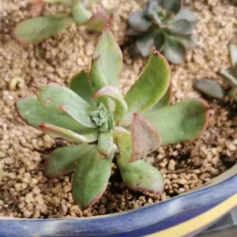 小红衣是景天科、拟石莲花属的一种多肉植物。叶片匙形,扁平细长,叶表具白粉,有明显的半透明边缘,…