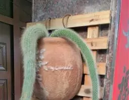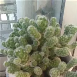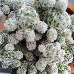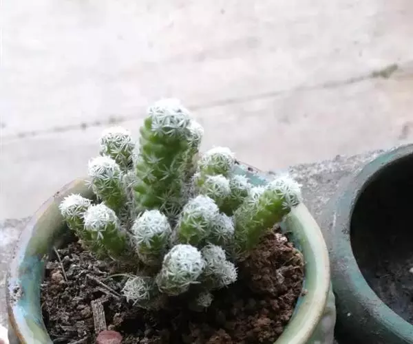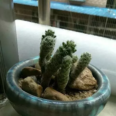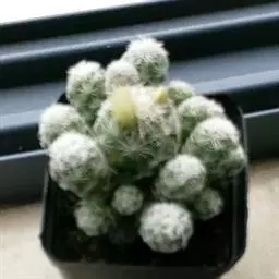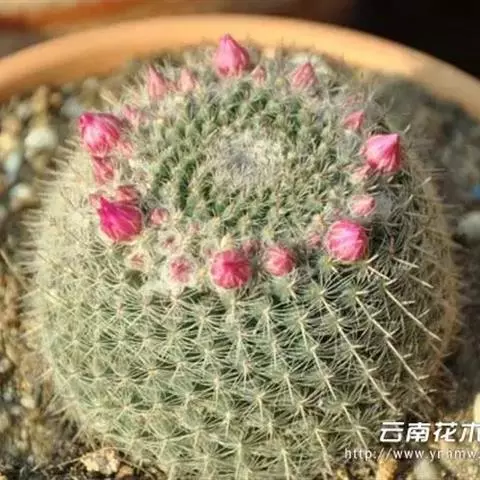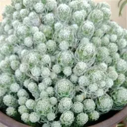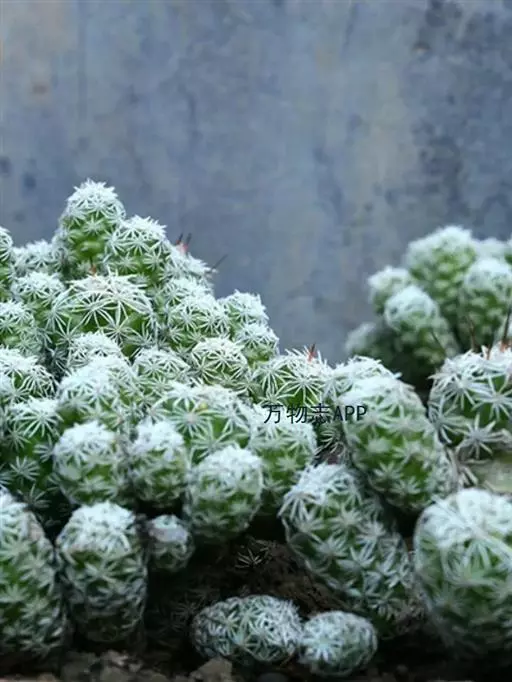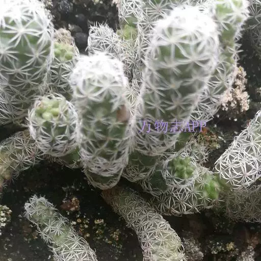 仙人掌科乳突球属,植株群生,小短圆筒形。单体球径2~3cm,体色灰绿色。白色刚毛样短小周刺12~15枚;白色细针样中刺1枚。春季侧生小型淡黄色钟状花,花径约1cm。