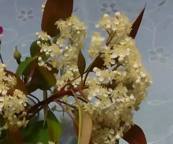 石楠花,学名Photinia serrulata Lindl.,英文名称为Photinia,别名千年红、扇骨木等。蔷薇科石楠属常绿灌木或小乔木,原产于中国。花期4—5月,果期10月。圆形树冠,叶丛浓密,嫩叶红色,花白色、密生,冬季果实红色,鲜艳著目,是常见的栽培树种;木材坚密,可制车轮及器具柄;叶和根供药用为强壮剂、利尿剂,有镇静解热等作用;又可作土农药防治蚜虫,并对马铃薯病菌孢子发芽有抑制作用;种子榨油供制油漆、肥皂或润滑油用;可作枇杷的砧木,用石楠嫁接的枇杷寿命长,耐瘠薄土壤,生长强壮。