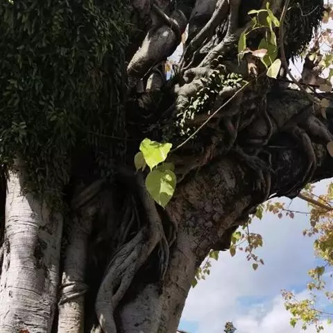 三角榕为常绿乔木或小乔木。叶片近三角形,薄肉质,全缘,长4~6厘米,宽3~5厘米,浓绿色。