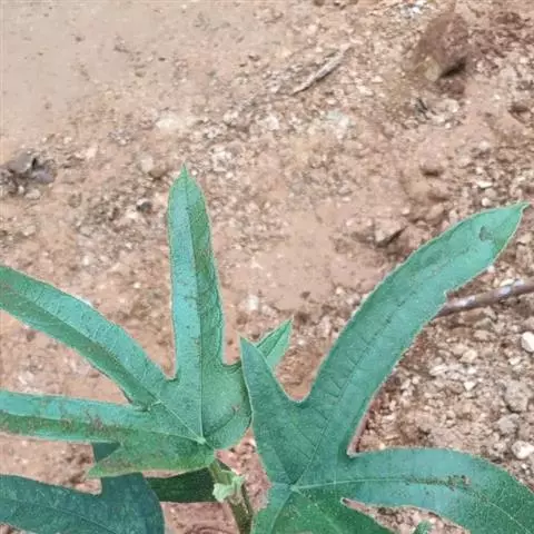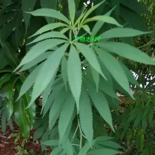 叶掌状全裂,裂片披针形或线状披针形,长7-15厘米,中裂片最长,宽0.5-2厘米,先端渐尖,基部狭楔形,表面深绿,微被糙毛,背面幼时密被灰白色贴状毛后变无毛,边缘具向内弯的粗锯齿,中脉及侧脉在表面微下陷,背面隆起;叶柄长3-15厘米,密被灰白色贴伏毛;托叶线形。