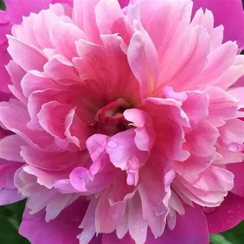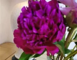 花朵蔷薇型。花蕾圆尖形。花紫红色,有光泽;花径17厘米×9厘米。花瓣多轮质硬,排列整齐,基部具墨紫色斑;部分雄蕊常有瓣化现象;雌蕊多而小,房衣暗紫红色,偶有结实。花梗较长而硬,花朵直上。中开花品种。