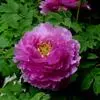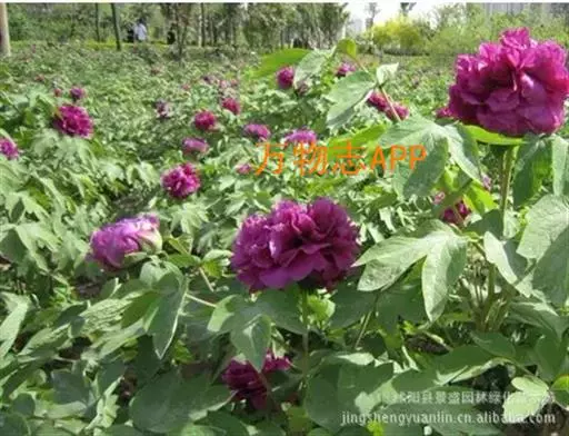 洛阳红(学名:Paeonia suffruticosa cv. 'Luoyang Red'):牡丹品种,落叶灌木。株型高,直立。分枝较细而硬。叶宽卵形,表面绿色,无毛,背面淡绿色,有时具白粉,沿叶脉疏生短柔毛或近无毛。花单生枝顶,苞片5,长椭圆形,大小不等;萼片5,绿色,宽卵形,大小不等;花朵蔷薇型。花蕾圆尖形。花紫红色,有光泽。花丝上部白色,花药长圆形,花盘革质,杯状,紫红色;心皮5,密生柔毛。蓇葖长圆形,密生黄褐色硬毛。花期5月;果期6月。