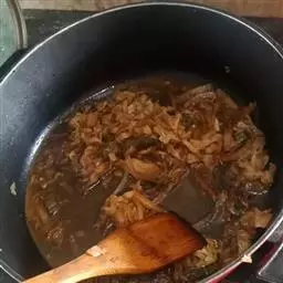 5.下入葱、姜、蒜和洋葱在香料油中炒香,加入茶树菇用油煸一下