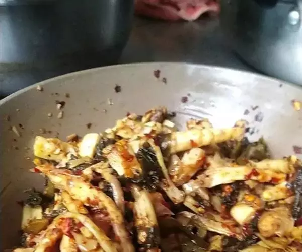 1.首先,过水的和过油的配菜整理好:将水发的木耳和香菇放到干净的锅里,控干水分。配菜的土豆、青笋、莲藕等油炸干,盛起,加入孜然、胡椒粉、辣椒粉、白糖、盐拌匀。