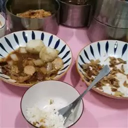 前腿肉250g、洋葱120g、青椒40g、红椒40g、干子100g、莲藕200g、土豆150g