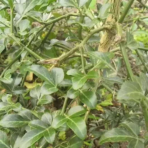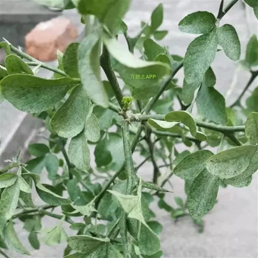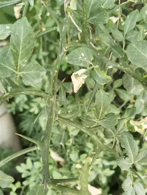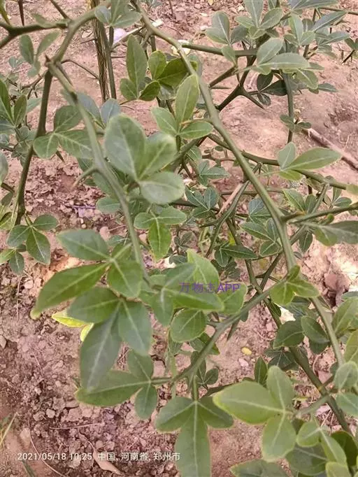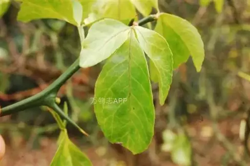 枳是小乔木,株高1-5米不等,树冠伞形或圆头形。枝绿色,嫩枝扁,有纵棱,刺长达4厘米,刺尖干枯状,红褐色,基部扁平。叶柄有狭长的翼叶,通常指状3出叶,很少4-5小叶,或杂交种的则除3小叶外尚有2小叶或单小叶同时存在,小叶等长或中间的一片较大,长2-5厘米,宽1-3厘米,对称或两侧不对称,叶缘有细钝裂齿或全缘,嫩叶中脉上有细毛。