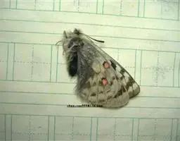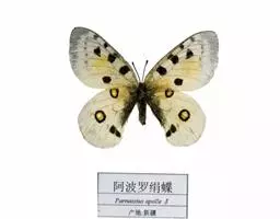 阿波罗绢蝶:翅展约7-8.4厘米。前翅较圆,白垩色,翅表有许多黑点、灰白斑及无鳞透明区,…