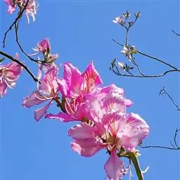 洋紫荆:落叶乔木;树皮暗褐色,近光滑;幼嫩部分常被灰色短柔毛;枝广展,硬而稍呈之字曲折,无毛。叶近…