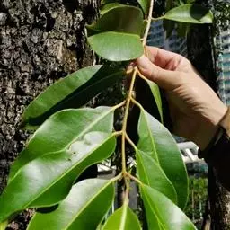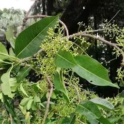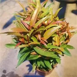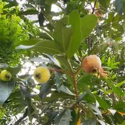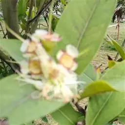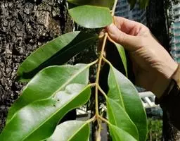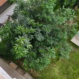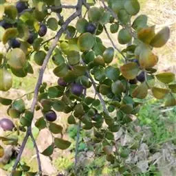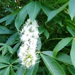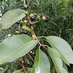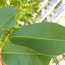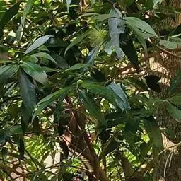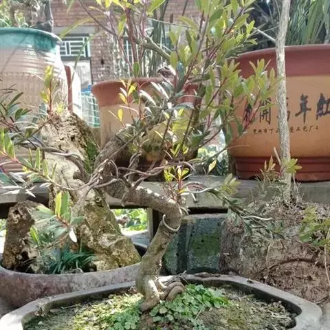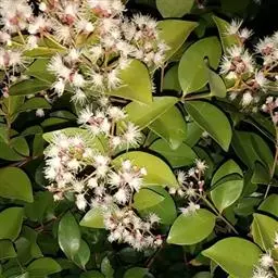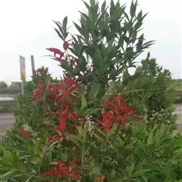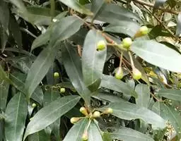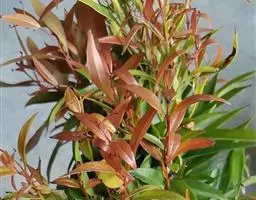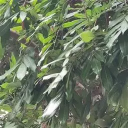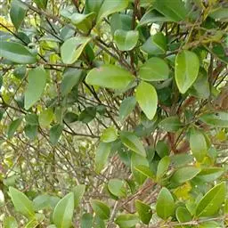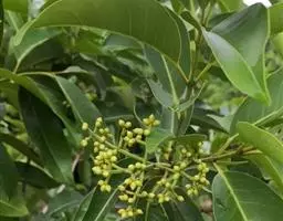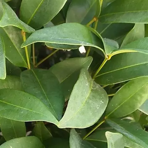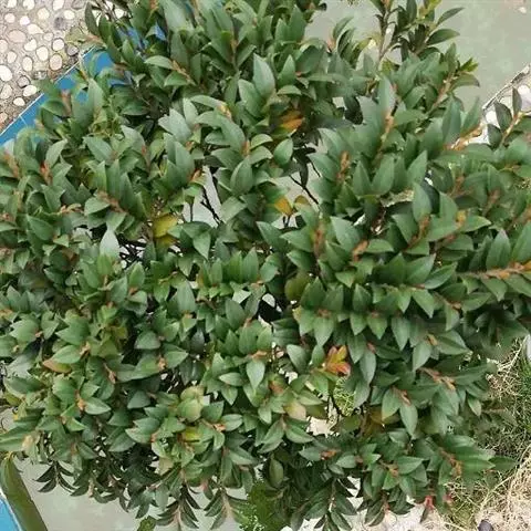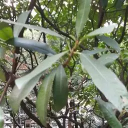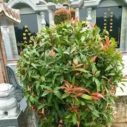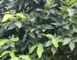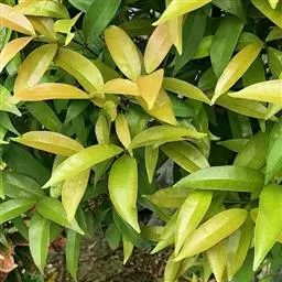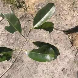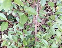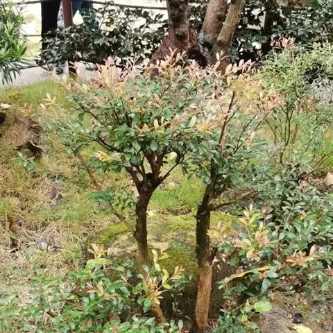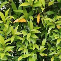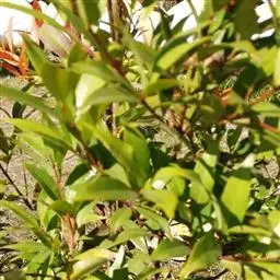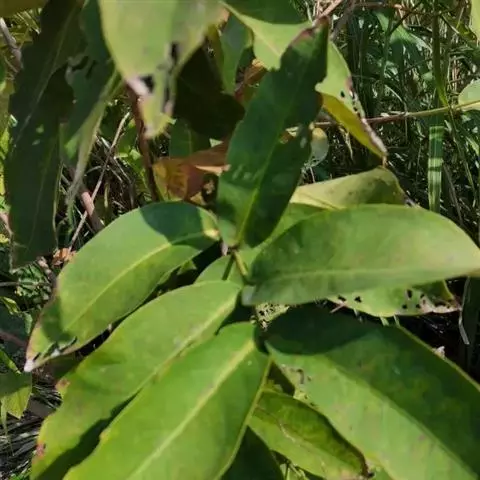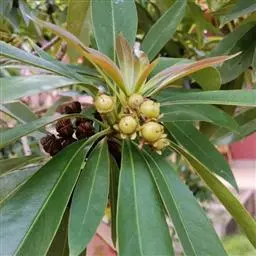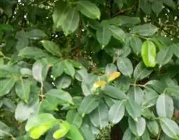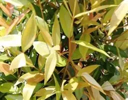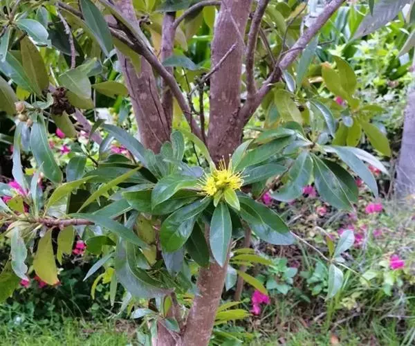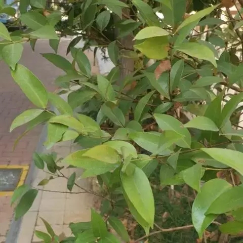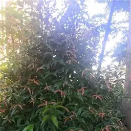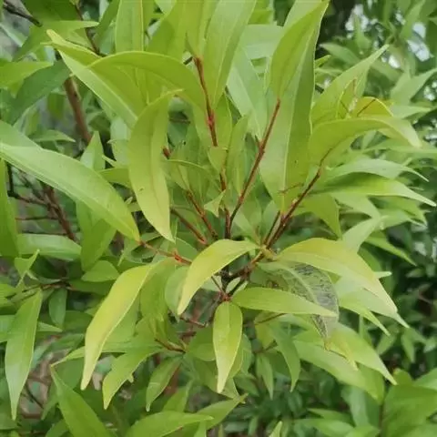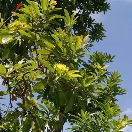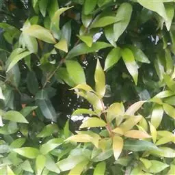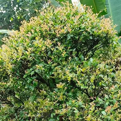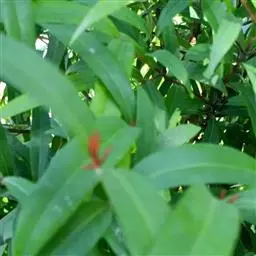 常绿乔木,株形挺拔,主干明显,6年生植株树高可达5米。叶色亮绿,叶对生、互生或丛生枝项,披针形,全缘,革质,叶表光滑,新叶带有红色,揉搓有番石榴气味。